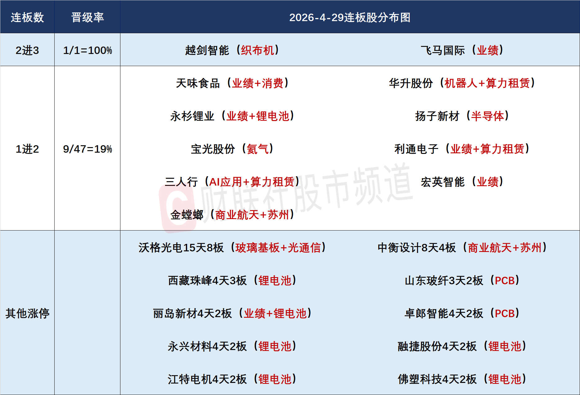 4月29日连板股分析:连板股晋级率不足二成 锂电产业链全线走强