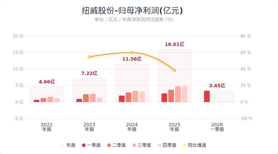 蓝鲸新闻4月29日电,纽威股份(603699.SH)公告称,2026年第一季度实现营业收入18.13亿元,同比增长16.53%;归属于上市公司股东的净利润为3.45亿元,同比增长31.40%。业绩变动主要系本期销售增长所致。小财注:公司Q1净利润3.45亿,2025年Q4净利润4.87亿,据此计算,Q1净利润环比下降29%。