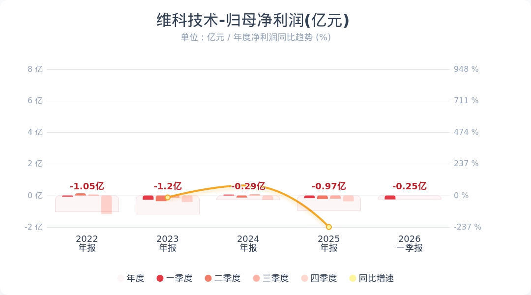 蓝鲸新闻4月29日电,维科技术(600152.SH)公告称,2026年第一季度实现营业收入3.65亿元,同比增长33.27%;归属于上市公司股东的净利润亏损2519.73万元。业绩变动主要系销量增加以及售价上涨所致。小财注:公司Q1净利润-0.25亿,2025年Q4净利润-0.37亿,据此计算,Q1净利润环比持续亏损。