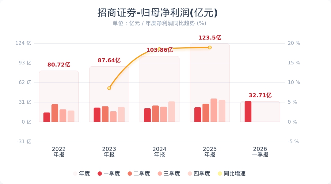蓝鲸新闻4月29日电,招商证券(600999.SH)公告称,2026年第一季度实现营业收入69.73亿元,同比增长47.96%;归属于上市公司股东的净利润为32.71亿元,同比增长41.73%。业绩变动主要系自营业务和经纪业务收入增加所致。小财注:公司Q1净利润32.71亿,2025年Q4净利润34.78亿,据此计算,Q1净利润环比下降5%。