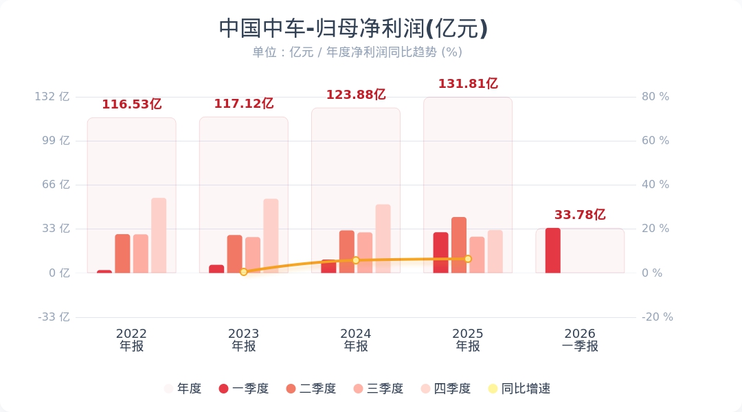蓝鲸新闻4月29日电,中国中车(601766.SH)公告称,2026年第一季度实现营业收入538.19亿元,同比增长10.57%;归属于上市公司股东的净利润为33.78亿元,同比增长10.66%。业绩变动主要系本期公司铁路装备以及新产业收入增加所致。小财注:公司Q1净利润33.78亿,2025年Q4净利润32.17亿,据此计算,Q1净利润环比增长5%。