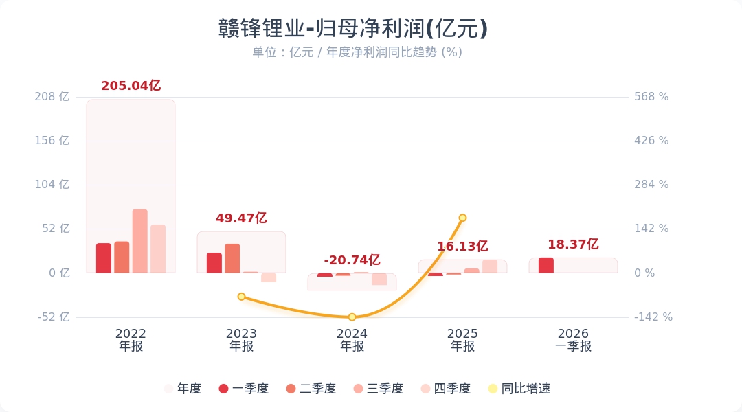 蓝鲸新闻4月29日电,赣锋锂业(002460.SZ)公告称,2026年第一季度实现营业收入91.96亿元,同比增长143.81%;归属于上市公司股东的净利润为18.37亿元,上年同期亏损3.56亿元,同比扭亏为盈。业绩变动主要系本期锂系列产品和锂电池系列产品价量齐升所致。小财注:公司Q1净利润18.37亿,2025年Q4净利润15.87亿,据此计算,Q1净利润环比增长15%。