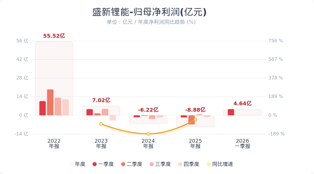 蓝鲸新闻4月29日电,盛新锂能(002240.SZ)公告称,2026年第一季度实现营业收入32.84亿元,同比增长378.58%;归属于上市公司股东的净利润为4.64亿元,同比扭亏为盈。业绩变动主要系报告期内,得益于新能源行业的快速发展,市场对锂盐产品的需求持续增长,锂盐产品的销售价格较上年同期有较大幅度上涨。叠加公司印尼工厂销售出货,公司锂盐产品销售量价齐升,使得公司营业收入,归属于上市公司股东的净利润等财务指标均较上年同期大幅上涨。小财注:公司Q1净利润4.64亿,2025年Q4净利润-1.36亿,据此计算,Q1净利润环比扭亏为盈。