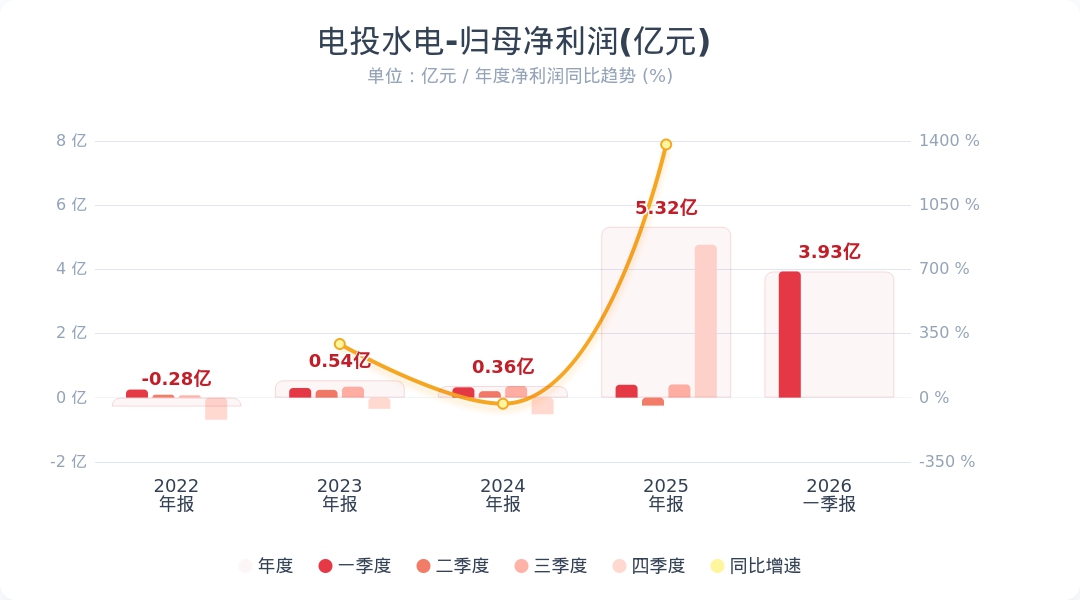 蓝鲸新闻4月29日电,电投水电(600292.SH)公告称,2026年第一季度实现营业收入24.75亿元,同比下降18.55%;归属于上市公司股东的净利润为3.93亿元,同比增长168.00%。业绩变动主要系2025年一季度实施了湖南省外新能源资产剥离,产生了较大金额股权转让所得税费用,导致净利润和每股收益同比增加。小财注:公司Q1净利润3.93亿,2025年Q4净利润4.76亿,据此计算,Q1净利润环比下降17%。