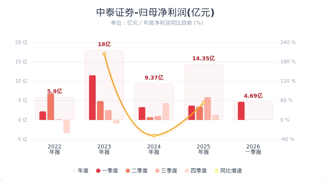 蓝鲸新闻4月29日电,中泰证券(600918.SH)公告称,2026年第一季度实现营业收入31.07亿元,同比增长25.14%;归属于上市公司股东的净利润为4.69亿元,同比增长26.80%。业绩变动主要系经纪业务手续费净收入同比增加所致。小财注:公司Q1净利润4.69亿,2025年Q4净利润1.35亿,据此计算,Q1净利润环比增长247%。