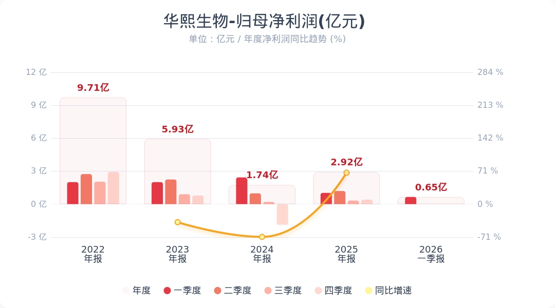蓝鲸新闻4月29日电,华熙生物(688363.SH)公告称,2026年第一季度实现营业收入8.29亿元,同比下降23.06%;归属于上市公司股东的净利润为0.65亿元,同比下降36.55%。业绩变动主要系皮肤科学创新转化业务收入同比下降所致。小财注:公司Q1净利润0.65亿,2025年Q4净利润0.4亿,据此计算,Q1净利润环比增长62%。