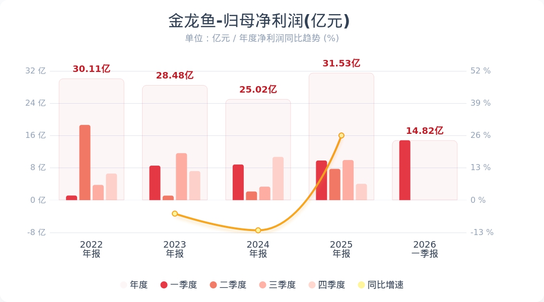 蓝鲸新闻4月29日电,金龙鱼(300999.SZ)公告称,2026年第一季度实现营业收入655.31亿元,同比增长10.92%;归属于上市公司股东的净利润为14.82亿元,同比增长50.98%。业绩变动主要系厨房食品、饲料原料及油脂科技产品的销量较上年同期均有所增加,以及厨房食品在消费品、餐饮及食品工业渠道的销量增长,包装油产品营销策略带来销量增长及产品结构优化,面粉和大米业务利润因销量增长而提升所致。小财注:公司Q1净利润14.82亿,2025年Q4净利润4.04亿,据此计算,Q1净利润环比增长266%。
