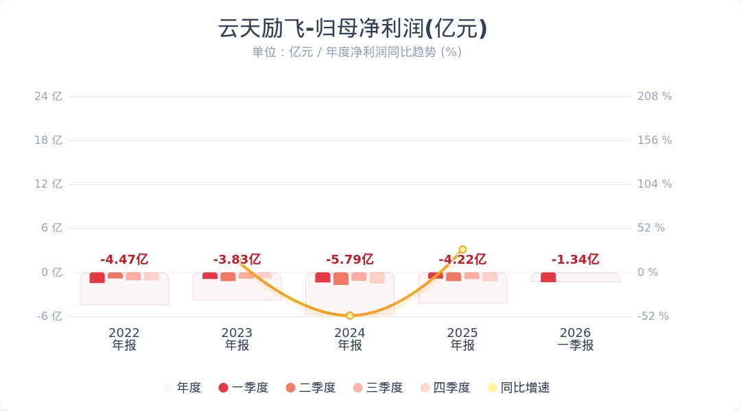 蓝鲸新闻4月29日电,云天励飞(688343.SH)公告称,2026年第一季度实现营业收入3.12亿元,同比增长17.97%;归属于上市公司股东的净利润亏损1.34亿元。业绩变动主要系本期研发投入较上年同期同比增加所致。小财注:公司Q1净利润-1.34亿,2025年Q4净利润-1.24亿,据此计算,Q1净利润环比持续亏损。