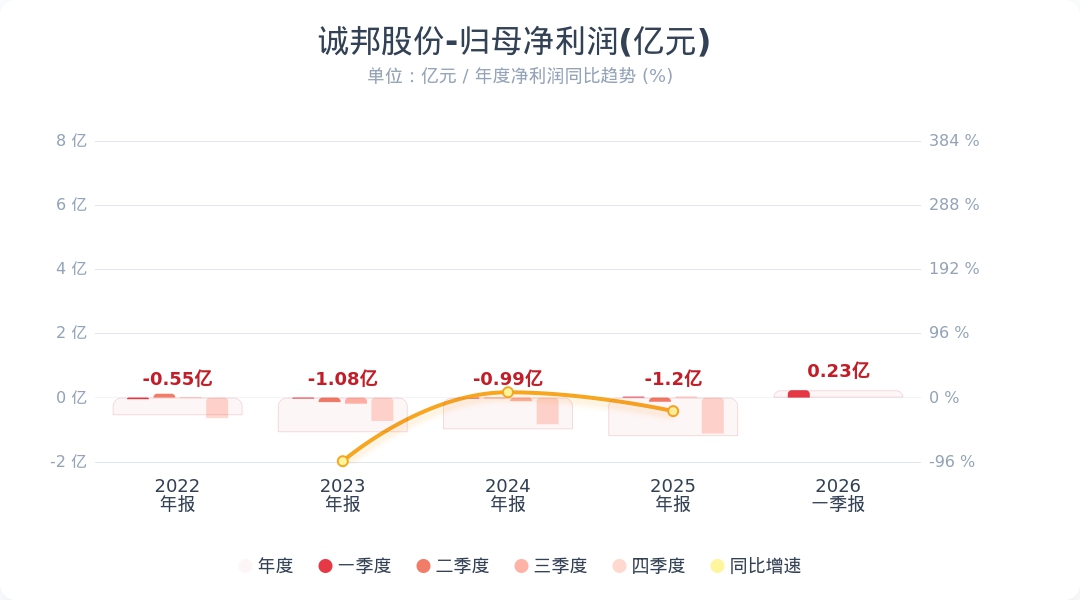 蓝鲸新闻4月29日电,诚邦股份(603316.SH)公告称,2026年第一季度实现营业收入1.94亿元,同比增长100.47%;归属于上市公司股东的净利润为2349.26万元,同比增长693.74%。业绩变动主要系报告期内半导体存储业务收入和利润大幅增长,及生态环境建设业务部分已计提坏账的应收账款本期收回冲减信用减值损失所致。小财注:公司Q1净利润0.23亿,2025年Q4净利润-1.12亿,据此计算,Q1净利润环比扭亏为盈。