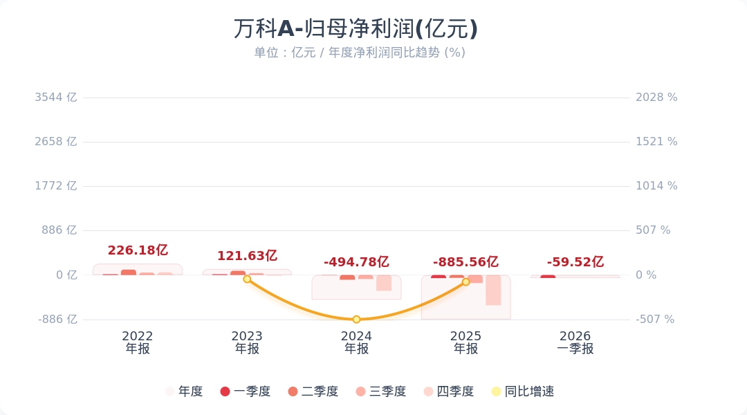 蓝鲸新闻4月29日电,万科A(000002.SZ)公告称,2026年第一季度实现营业收入289.28亿元,同比下降23.86%;归属于上市公司股东的净利润为亏损59.52亿元,上年同期为亏损62.46亿元,同比减亏4.71%。业绩变动主要系开发业务亏损影响。小财注:公司Q1净利润-59.52亿,2025年Q4净利润-605.41亿,据此计算,Q1净利润环比持续亏损。