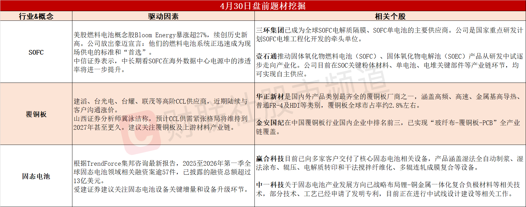 ①美股燃料电池龙头暴涨超27%,SOFC或成AI数据中心供电首选。②覆铜板掀涨价潮,供需紧张格局或维持到2027年甚至更久。③固态电池产业化加速,机构称新增设备有望成为刚需。